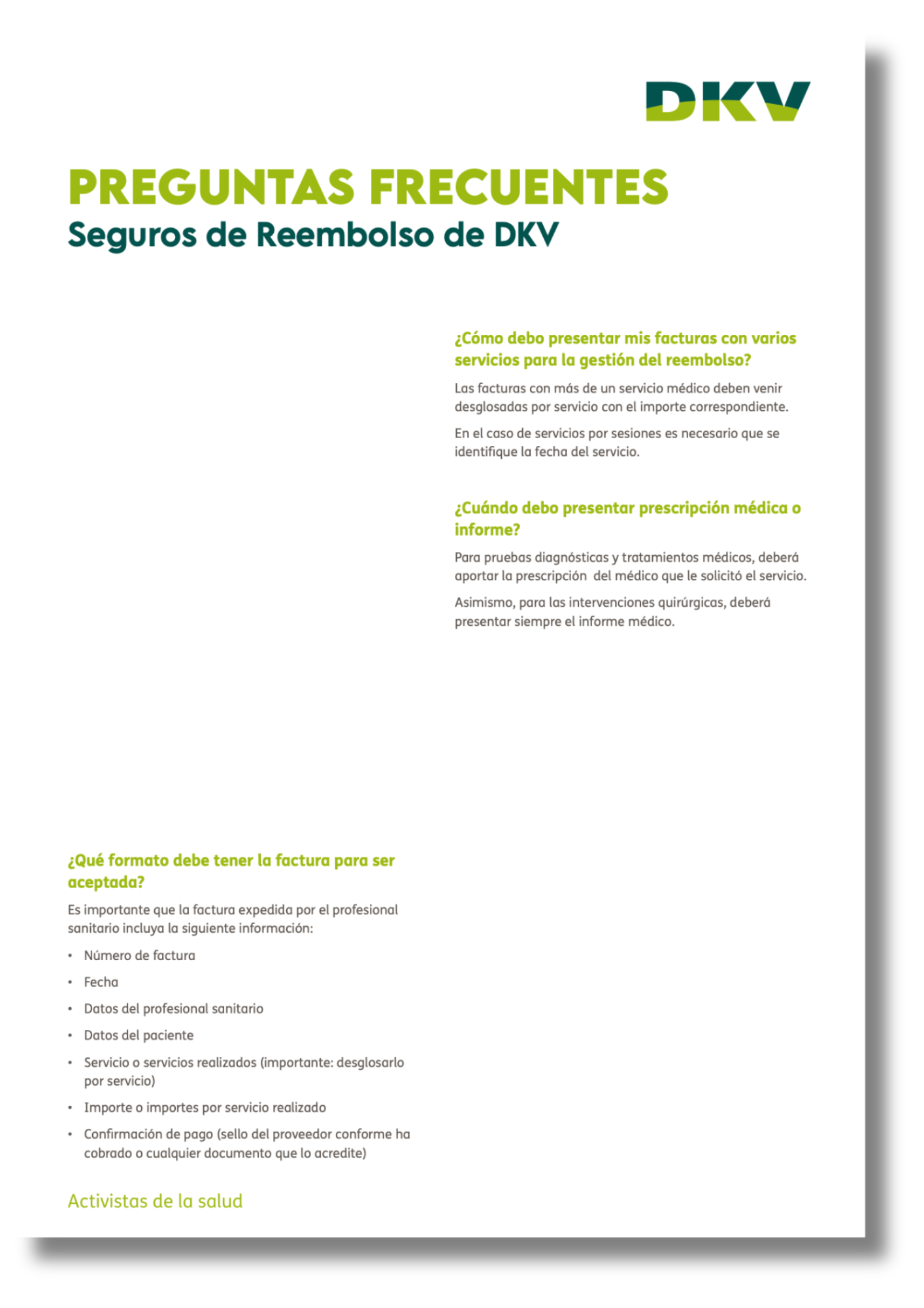 Tal y como detallan algunas Compañías, como es el caso de DKV, en sus documentos internos y en la sección de 'Preguntas frecuentes' de sus webs, al hablar de Seguros de Reembolso es, de igual modo, conveniente preguntarse: '¿Qué formato debe tener la factura para ser aceptada?'.